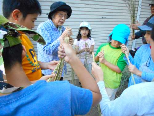 藁縄(わらなわ)をなう 脱穀の片付けが済んでから、稲わらをなうことを学習しました。 縄をなう子どももいれば、リースをつくる子どももいました。