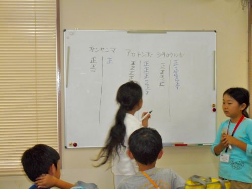 場所 生田緑地 参加者 (OG) 中川 悠 (3)山下はなの、田村 和 (2)大橋拓真、工藤千穂、軸丸陽希、佐藤晴奈 (1)齋藤凛々子、猿谷明衣、鈴木美舟、上村勇翔、小林虎徹、小林祇龍、佐藤功一、田通 潤、 中垣祐輝、福田公成 16人 講師 岩田臣生、岩田芳美、梅原和仁、神山幸雅、藤間X子 5人 市民活動室に集合して、はじめに、前回救出して各自が持ち帰ったヤゴがどうなったかを確認することにしました。 どんな数値を調べるかは、ホワイトボードに書き出してくれるという里山 2年生に任せました。 今年は、皆さんが持ち帰ったヤゴは順調に羽化しているようです。 持ち帰ったヤゴのうち羽化した個体数は、次の通りでした。 ギンヤンマ 11 シオカラトンボ 23 アカトンボ 36