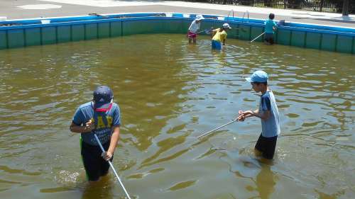 場所 稲田公園児童プール 参加者 里山の自然学校3年生 大橋拓真、工藤千穂、軸丸陽希 里山の自然学校2年生 猿谷明衣、鈴木美舟、仲田稔里、上村勇翔、佐藤功一、中垣祐輝、福田公成 里山の自然学校1年生 中村一冴、和 朋花、杉本大知、仲田千春、花岡澄空、本多琉惟 山下ねのは 17名(今年度登録参加者 22名、今回欠席者 5名) 講師 岩田臣生、岩田芳美、梅原和仁、神山幸雅、山本 晃 計 22名 9:00〜 稲田公園児童プールには早めに着いて、事務所と更衣室のシャッターを開け、道具類を降ろしてから、プールの排水弁を開けて、排水を始めました。 里山の自然学校は生田緑地で活動していますが、プールのヤゴの救出作戦だけは、同じ多摩区内の稲田公園児童プールで活動します。 昨年のプール営業終了後に、このプールで産卵し、孵化したトンボのヤゴを救助して、羽化させてやることが目的です。 年によって、救助できるヤゴの数は異なり、過去の記録では、少ない年は781、多い年は7,015でした。 今年はどうなるでしょうか。 10:00〜 小田急線の事故のために、別ルートで来園することになった参加者は遅れての参加となりましたが、事務所内に集合して、この日の活動について説明してから、プールに移動しました。