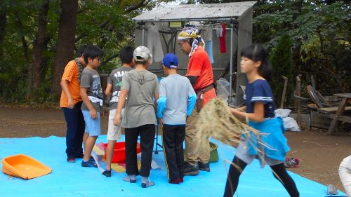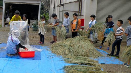 場所 生田緑地 田圃のオダ場〜生田緑地整備事務所裏、市民活動室 参加者 里山の自然学校2年生 杉本大知、花岡澄空、森村 玄、森村 舜 里山の自然学校1年生 杉谷祐花、三木 優、川口真瑠 岡部美海、小野寺花柑、粕川結太、堅田真帆、鈴木眞之介、中村駿介、長谷玲奈 14名(今年度登録参加者 21名) 卒業生 佐藤晴奈、猿谷明衣 講師 岩田臣生、岩田芳美、梅原和仁、藤間X子、山本 晃 5名 応援参加(水田ビオトープ班)田村成美、政野祐一、(里山倶楽部B)三上正徳、浅井禎和 4名 参加者合計 25名 台風 25 号の影響は風のみで、雨は免れ、9/30(日) に稲刈りして、オダに干していた稲束を脱穀する日が来ました。 今回も、里山倶楽部メンバーの応援を受けての開催となり、9:00 に整備事務所裏に集合して、オダに干した稲束にかけてあったブルーシートを外して、整備事務所裏に運び、 バックヤードに広げて、足踏み式イネコキ機をセットして、脱穀を始められる状態にすることから活動を始めました。 勿論、ついでに運べるだけの稲束も運びました。 里山の自然学校としては、10 時に市民活動室に集合し、この日の活動について説明し、応援参加者の紹介を行ってから、稲束を取りにオダ場に向かいました。 半袖の子どもたちが素手で稲束を抱いて運ぶことについて、腕がアレルギー反応を起こしたり、傷ついたりするから、ポリ袋を使わせたいという提案があり、 手持ちのポリ袋を使ってみたのですが、稲束の半分程しかポリ袋に入らなかったため、滑りやすいポリ袋を使ったことが良かったのかどうかは分かりませんでした。 多分、運ぶ時は長袖のシャツ着用が望ましいのだと思います。 稲束をオダから外すのは、大人が担当して、生田緑地整備事務所裏までの稲束運びが始まりました。