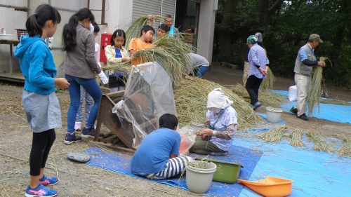 生田緑地整備事務所裏に稲束を運び終えて、いよいよ脱穀作業開始です。 使う機械は半世紀以上昔の足踏み式イネコキ機ですが、当時、地元の工場で製造されていた有名なミノル式親王號というイネコキ機で、「最新式」と標記されている時代遅れの機械です。 今では、コンバインハーベスターを使って、収穫・脱穀・選別を行うのが普通ですが、過程をブラックボックスで済ませてしまうのではなく、 一つ一つの過程を体験することが大切だと考えています。 収穫は前回の稲刈りであり、今日は、足踏み式イネコキ機による脱穀、唐箕による選別です。 足でドラムを回転させながら、イネコキを行うのは慣れていないと大変なので、足踏みは、誰かがサポートするようにしています。 自分の手の大きさ、握力を考えて、選んだ稲束を、しっかり握って、ドラムを撫でるようにすれば、籾の部分が外れるのですが、握る力が弱いと、手から抜けて、稲が巻き込まれてしまいます。 その度に、イネコキ機を止めて、巻き込んだ稲を取り出して、それは手作業で籾を外すことになります。 慌てて素手を出せば、もっと大変なことになりますから、いざという時は手で止めるために、サポータが手袋をはめて付き添っています。