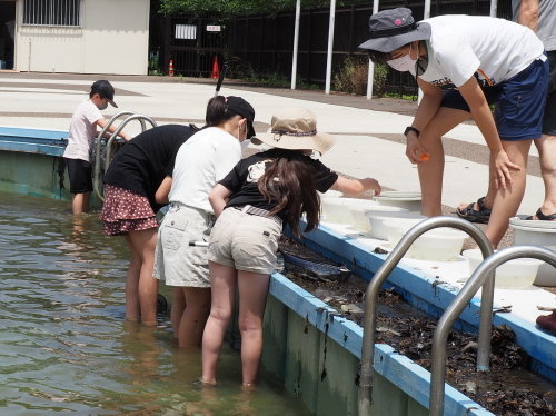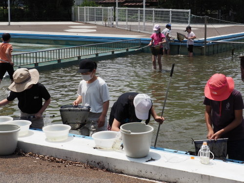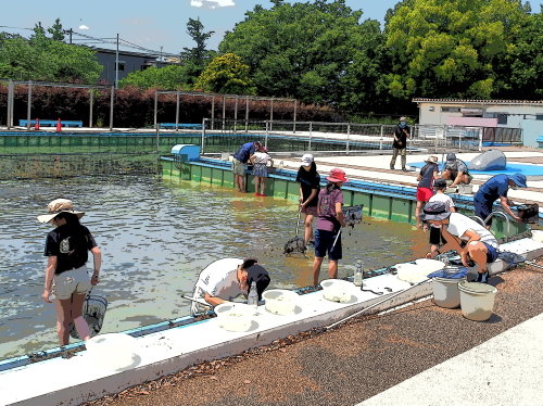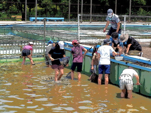 場所 稲田児童プール 参加者 里山の自然学校 2 年生 5 名 畠山夏昊 (小学 6 年生 1 名) 佐藤朝陽、佐藤天音、軸丸朝咲、原田天雅(小学 5 年生 4 名) 里山の自然学校1年生 6 名 佐藤弥里(小学 5 年生 1 名) 池上豪一郎、加藤帆乃果、玉木 遥、橋本怜奈、房安弘太郎(小学 4 年生 5 名) 卒業生 佐藤晴奈 12 名 事務局・講師 岩田臣生、岩田芳美、工藤思由 3 名 水田ビオトープ班応援 東 陽一、岩渕裕輝、政野祐一 3 名 総勢 18 名 ● 9:00 児童プールの排水弁開放 例年通り、1 時間前に、プールの排水を始めましたが、未明の降雨が激しかったのか、プールは満水状態でした。 一昨日、鍵の解錠などの確認のために来た時と変わらず、水は澄み切って、水底の落葉や泥は少なかったので、ヤゴはいるのだろうかと思いましたが、 良く見ると、ハイイロゲンゴロウ、オタマジャクシなどの姿が見られ、試しに一網入れて見たら、シオカラトンボのヤゴが採れましたので、安心して、参加者を待ちました。 ●10:00 参加者の集合を確認してから、各自が好きな手網を選び、それと洗面器を持って、一番浅いプールに移動し、ミッションの説明を行いました。 水底の落葉や泥を掬って、プールサイドの水際に運んで、その中に潜んでいるヤゴを見つけ出して、各自の洗面器に入れることが、今回の活動になります。 勿論、洗面器には、濁る前の水を汲んでおきます。 ヤゴだけでなく、気になった生きものは全て採集して、観察した方が良いのですが、コミズムシなどは無視されていました。 周囲では、ギンヤンマが次々に採集されていましたから、気持ちは常に、ギンヤンマにあったのでしょう。 今回、小さなペットボトルにヒモをつけて、首からぶら提げておいて、ユスリカの幼虫など、ヤゴのエサになりそうなものを採集して入れておくように勧めたのですが、皆さんが実行していました。
