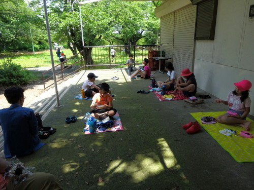 ●12:00 お昼のお弁当にしました。 プール前のポーチは、例年だと、イベントがあって使えないのですが、新型コロナ感染対策のため、イベントが禁止されていたので、今回はポーチで、social distance をとって、 お弁当を食べることができました。 風が抜けて、涼しく、休憩できました。