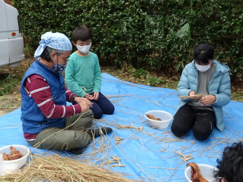 昼からは、生田緑地整備事務所に戻って、バックヤードにシートを敷いて、そこで、イネワラの馬づくり、リースづくりなどを行いました。