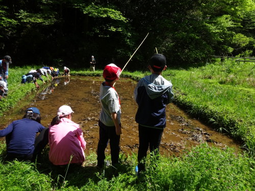 @たくさんの昆虫や植物などの生き物に出会えたらいいと思います。 一年のころやって楽しかった田植え、ヤゴ救出、だっこくをやりたかったから。 A今日はたくさんの植物が見れて良かったです。 昆虫は少ないと思っていましたが、シャクトリムシやオサムシなどのたくさんの昆虫に出会えて良かったです。 田んぼのオタマジャクシを見たときはあまりの量にびっくりしました。 よーく見ると、ドジョウらしき魚もいて、つかまえようと思いましたが、逃げ足が速くてとてもつかまえづらかったです。 でも、たくさんのオタマジャクシが見れてよかったです。 お昼休みでは、サワガニがいてびっくりしました。本当に楽しかったです。