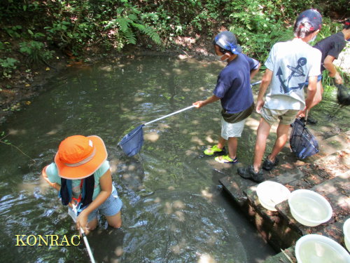 生物調査 初めは、池の東半分をB班、西半分をA班の活動域とし、途中の飲水休憩後は交替しました。 ただ、池の出入りは、全員、デッキの階段を利用することにしました。 生物調査B班 なかなか水に入れずにいるA班の男子に構わずに、B班女子は全員、さっさと水に入って、膝上までの水に臆することなく、東側に移って、採集を始めました。 東側の水域では、カワニナ、トンボのヤゴ、オタマジャクシなどが、次々に、採集できました。