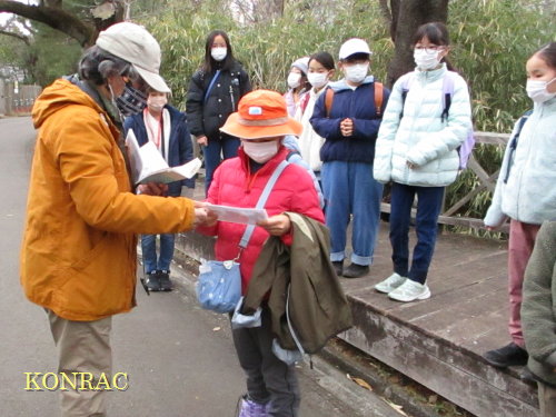 日時 2022年 2月 13日(日) 10:00〜12:00 小雨 場所 生田緑地 参加者 14 名 (里山3年)原田天雅、軸丸朝咲 (里山2年)池上豪一郎、佐藤弥里、加藤帆乃果、房安弘太郎 (里山1年)青木いろは、柴田一花、 久保田あかり、柴田綾乃、須貝愛桜、舟越 葵、宮本琴羽、吉田絃 講師・事務局 岩田臣生、岩田芳美 合計 16 名 この日は、里山の自然学校2021の最終回です。 オミクロン株が流行して、小学校では学級閉鎖も見られる状態で、開催することに疑問を持たれた保護者の方もおられましたが、午前中のみの屋外活動として開催しました。 集合は谷戸へ降りる階段のデッキ付近とし、初めに集合写真を撮りました。