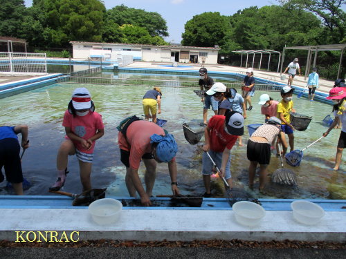場所 稲田公園児童プール 参加(里山の自然学校 3年生)池上豪一郎、房安弘太郎 (里山の自然学校 2年生)久保田あかり、柴田綾乃、舟越葵、吉田絃 (里山の自然学校 1年生)安達湊都、岩瀬恵育、塩田采央、辻 伊晴、 石垣来花、伊藤奏人、井上和音、卜部愛理、川口珠璃、河村桧弦、 久保田隼人、小林紗羅、北條真海、山内貴心 20 名( 1人欠席) 講師(事務局) 岩田臣生、岩田芳美 応援 東 陽一、伊澤高行、岩渕裕輝 卒業生サポーター 小野寺花柑 総勢 26 名 この日は、第 2 回里山の自然学校<プールのヤゴの救出作戦>です。 稲田公園児童プールには、8:50 に到着し、プールの排水弁を開けて、排水を始めました。 排水弁は錆びていて、軽くは回りませんでしたが、6/2(金)に使った鉄棒を梃子にして、回して、開栓しました。 プールの中は、今年も、ヤゴが身を隠せるような藻は殆んどありませんでしたが、手網で掬えば、採集できるでしょう。 水際に、半ば水に浸かった状態で、コノシメがいました。