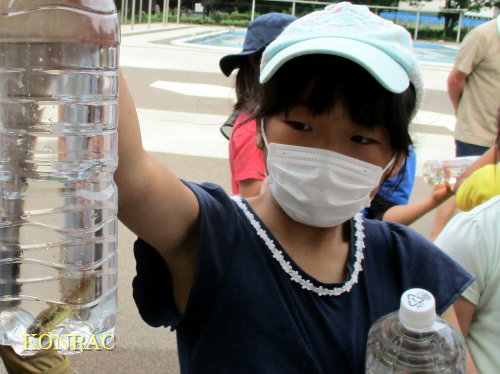 里山の自然学校では、救出したヤゴの一部を、子どもたちが自宅に持ち帰って、羽化するまでを観察することにしています。 持ち帰るためのペットボトルは、各自が用意して、水を満たし状態にして、そこに希望のヤゴを入れました。 ギンヤンマ1匹は、これを採集した子が持ち帰りました。