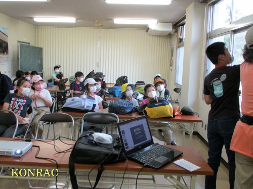 それから、スライドを使って、生田緑地のホタルについての座学を行いました。 ホタルとは何か、生田緑地のホタル、生田緑地の湧水、水辺の生物などについて、話しました。 その後、トイレを済ませてから外に出ました。 まず、ホタルブクロの観察を行いました。