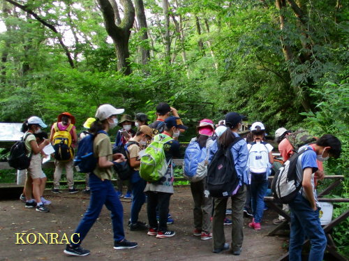 ピクニック広場辺りから、子どもたちの目は生きもの探しを始めました。 成長を始めたツリフネソウの葉上に、次々に、オオコシアカハバチの幼虫が見つかりました。