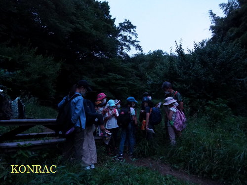 トイレを済ませて、谷戸へのゲートを開けて、全員がいることを確認して、谷戸に降りました。 萌芽更新地区下まで降りた所で、梅の木広場に残った事務局から電話がありました。 「変な男が入って来て、ベンチに座っている。皆が恐がっている。警備員を読んでほしい。」と言うのです。 そこで、子どもたちを梅の木広場に向かわせておいて、私は事務所に戻って、事務室にいた越智さんに状況を伝え、警備員への連絡を頼み、急いで、皆が待つ梅の木広場に向かいました。 変な男というのは大きなヘッドホンをつけていましたので、大きな声をかけても聞こえない様子でした。 そこで、ヘッドホンを外させて、事情を聴きましたが、閉鎖管理されていることを知らなかったと言い張るので、このことを説明し、退出をお願いし、戸隠不動口への階段の所まで同行し、 そこに到着した越智さんに後を任せて、皆と合流し、里山の自然学校<ホタル観察>を続けました。 さて、いよいよホタル観察です。 卒業生サポーターが 3人いましたので、この 3人を班長にして、三つの班に分け、班毎に、ホタルの出現数を調査することにしました。 数え方は、班長さんに任せました。 調査中、賑やかな班も、静かな班もありましたが、各班の構成と調査結果は次の様になりっました。 @小野寺花柑、石垣来花、川口珠璃、久保田あかり、小林紗羅、北條真海、山内貴心 出現数 55匹 A佐藤天音、安達湊都、池上豪一郎、伊藤奏人、井上和音、畠山泰知、房安弘太郎 出現数 35匹 B原田天雅、河村桧弦、久保田隼人、塩田采央、柴田綾乃、辻 伊晴、吉田 絃 出現数 55匹 頼もしい班長さんのお蔭で、岩田は一人でホタル調査を行えました。 その調査中、下の田圃附近で、新たに入って来た若い男女に出会い、閉鎖管理していることを説明し、退出してもらいました。 この二人は、戸隠不動口の閉鎖してあるフェンス・ゲートの脇から入ったので、そこから出ると言い置いて、階段を上って行きました。 その後はホタル調査を続けてから、皆と合流し、ハンノキ林上のデッキで、調査結果や感想を聴かせてもらいました。 岩田が子どもたちを連れてトイレに行っていた間、残った子どもたちはアブラコウモリの観察をしていたようです。 岩田が調査したホタルの出現数は 64匹 そして、21時近くなったところで、出口ゲートに向かい、ゲート前で解散して、西口と東口に分けて送り、この日の活動を終了しました。 |