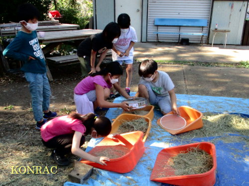 場所 生田緑地整備事務所裏 221002 参加(里山の自然学校 3年生)房安弘太郎 (里山の自然学校 2年生)久保田あかり、柴田綾乃、吉田絃 (里山の自然学校 1年生)安達湊都、塩田采央 石垣来花、伊藤奏人、卜部愛理、川口珠璃、河村桧弦、久保田隼人 小林紗羅、北條真海、山内貴心 15 名( 6人欠席) 卒業生サポーター)小野寺花柑 水田ビオトープ班応援)東 陽一、伊澤高行、田村成美 講師(事務局) 岩田臣生、岩田芳美 総勢 21 名 9:20 (生田緑地整備事務所裏ヤード) 脱穀を行う事務所裏ヤードには、石ころやクヌギのドングリなどが転がっていますので、全面を竹箒で掃きました。 それから、作業範囲2ヶ所にシートを敷いて、事務所による日陰のシートに、足踏み式イネコキ機を出して、ホコリを払い、作動部に潤滑剤を塗布して、イネコキができるように準備しました。