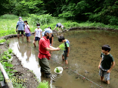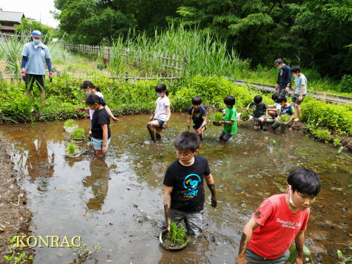 場所 生田緑地 市民活動室、生田緑地 参加(里山の自然学校 3年生)久保田あかり (里山の自然学校 2年生)安達湊都、伊藤奏人 (里山の自然学校 1年生)岩見南翔、早稲田壮真、佐々木和花、佐野詩織 坂本慶悟、杉下睦樹、ハラテックレオナルド翔太、山根浩敬 11 名(1人欠席) 卒業生サポーター 小野寺花柑 応援(里山の自然学校チーム)伊澤高行、冨田健斗 応援(里山倶楽部チーム)東 陽一、岩渕裕輝、加登勇司 応援(水辺チーム)上路ナオ子、田村成美、政野祐一 事務局・講師 岩田臣生 合計 21 名 4月に種籾を購入して、浸種し、10枚の育苗箱に播種して、マンションのベランダで育ててきた苗を車に積んで、生田緑地に運んで来ました。 今年は、暴風の日が数回あり、ビニール・トンネルが吹き飛ばされて、苗が風に弄ばれて、育苗箱には傷んだ苗も多く見られましたが、田植えは可能です。 田植えの日は、個人的には、辛い苗づくりから解放される日でもあります。