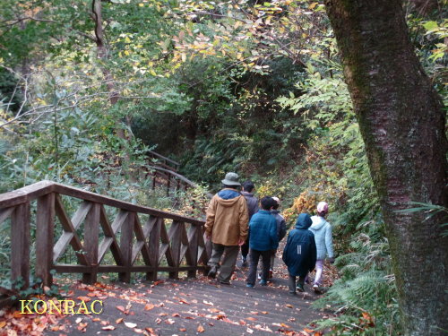 場所 生田緑地、市民活動室 参加(里山の自然学校 3年生)久保田あかり (里山の自然学校 2年生)安達湊都 (里山の自然学校 1年生)坂本慶悟、杉下睦樹、ハラテックレオナルド翔太、山根浩敬 6 名(6人欠席) 講師・応援 伊澤高行 講師・事務局 岩田臣生 合計 8 名 朝のうちは冷たい小雨が降っていて、気温は冬の里山でした。 この日の課題は、イネワラで縄を綯って、それを使って、里山の自然学校らしいクリスマス・リースなどをつくろうというものです。 そのために、生田緑地を探検して、秋の景色を楽しみながら、リースの飾りに使えそうな材料を里山から分けてもらうために、谷戸に降りました。