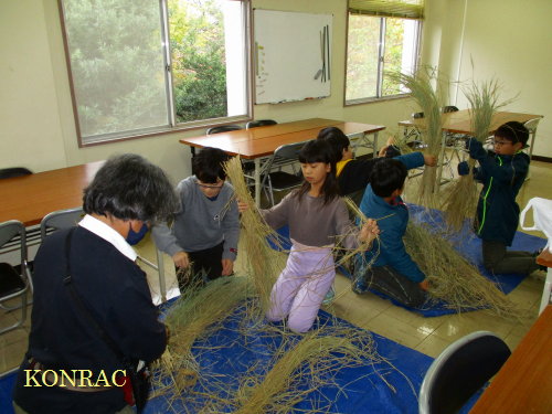 市民活動室に戻って、昼食のお弁当を食べました。 今回の参加者には、今年の生田緑地の谷戸の田圃で収穫した玄米を炊いてつくったおにぎりを配りました。 里山倶楽部でも、食べてもらっていますが、今年の米はコシヒカリで、なかなか旨いです。 食べ終わってから、室内にブルーシートを広げて、その上で、イネワラを綯いました。