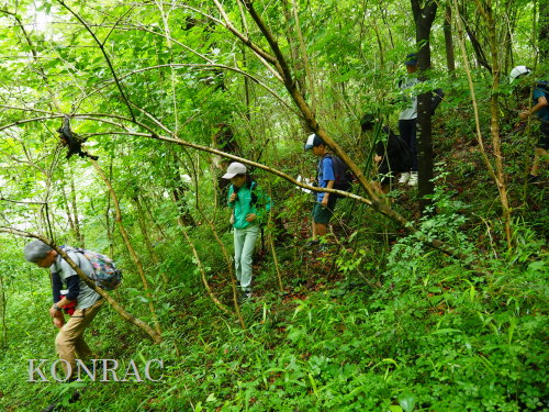 (自然観察) 午後は自然観察を考えていましたが、いつ雨が降ってもおかしくないような曇空のため、水辺にトンボが見られませんでした。 そこで、雑木林の自然観察を行うことにしました。