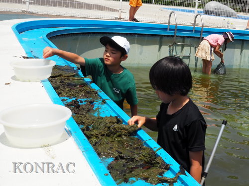 一番浅いプールは、活動を始めた時には、水が殆ど無くなっていて、落葉や藻などが水に浸かっている程度でした。 その溜まった落葉などを掬って、その中を調べると、そこにヤゴが隠れていることが分かります。 ヤゴは探し出すのだということが分かれば、後は、ヤゴが隠れていそうな場所を手網で掬って、ヤゴを採集できるようになります。 アカトンボ、イトトンボなどのヤゴを見つけ、更に、ギンヤンマのヤゴを誰かが1匹採集したら、 今度は自分がという気持ちになるのでしょうか、皆の動きが変りました。。 サポーターまでも、ヤゴの採集に夢中になってしまいました。