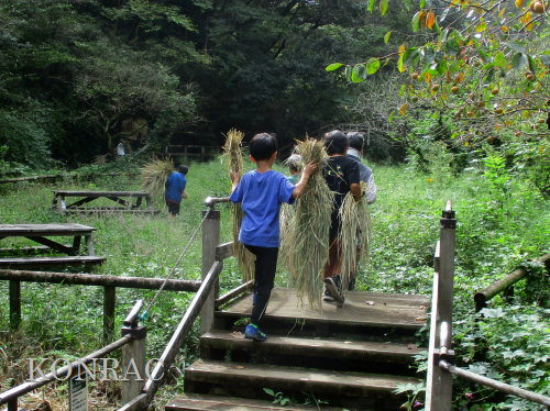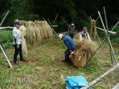 上の田圃地区のオダ場には、サポーターの皆さんが先に来ていて、オダに干していた稲束を降ろして、背負い籠に積んでいました。 背負い籠は二つだけですので、他の人は、抱き抱えて運びました。 稲束は全員で運びましたが、生田緑地整備事務所裏との間を1〜2回往復で運び終えました。