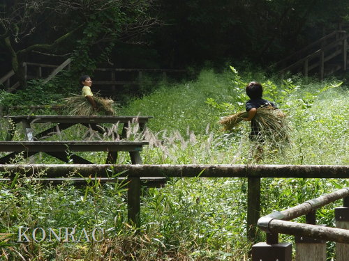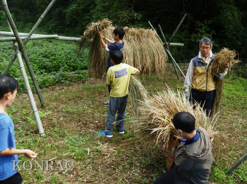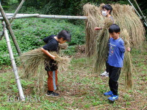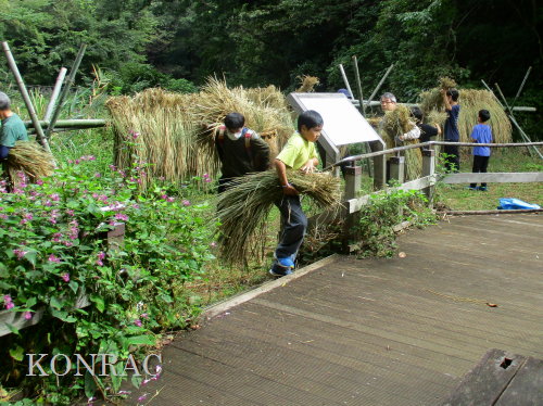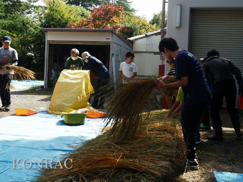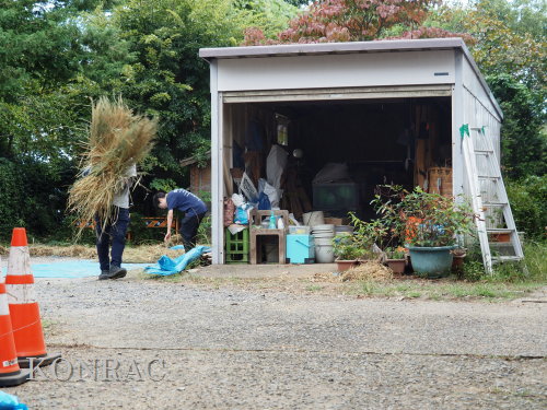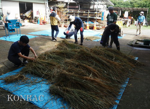 生田緑地整備事務所裏ヤードに、脱穀する稲束を運び終えました。