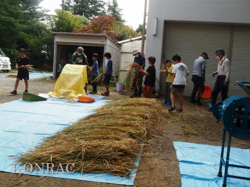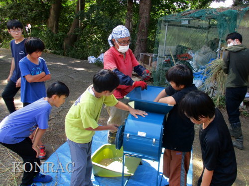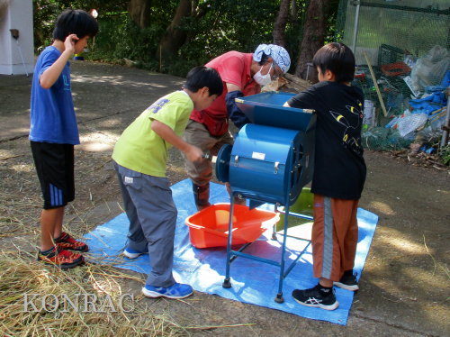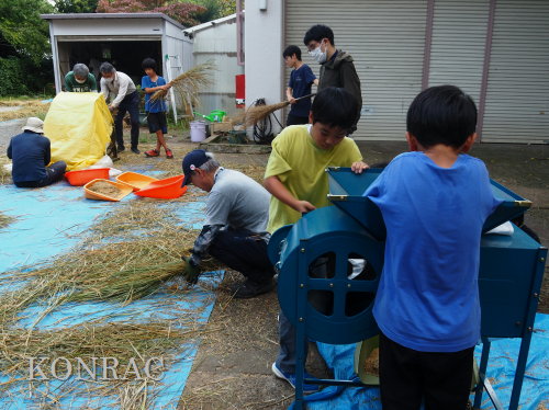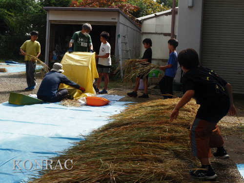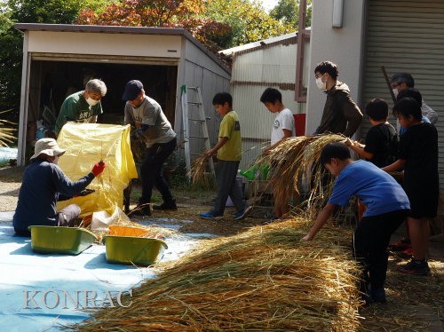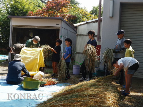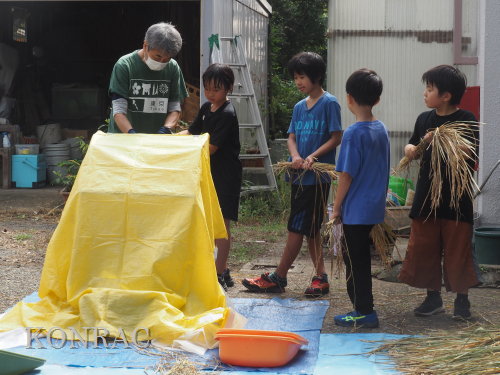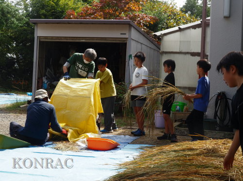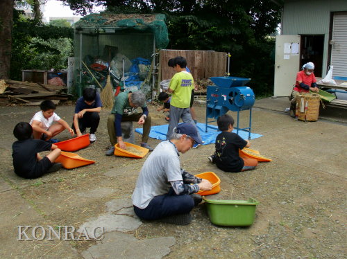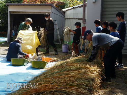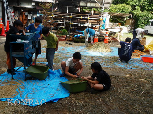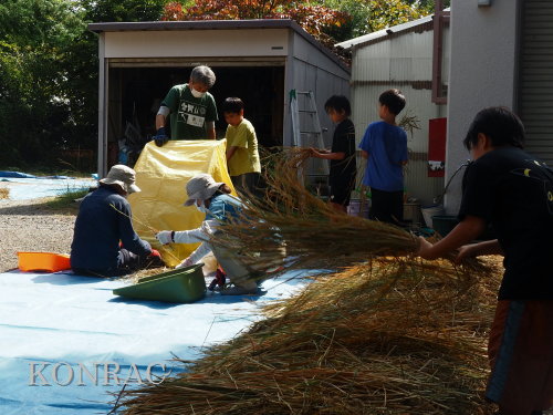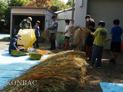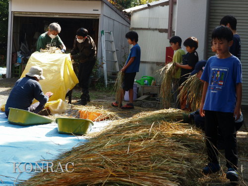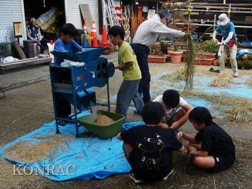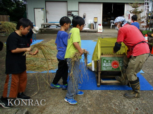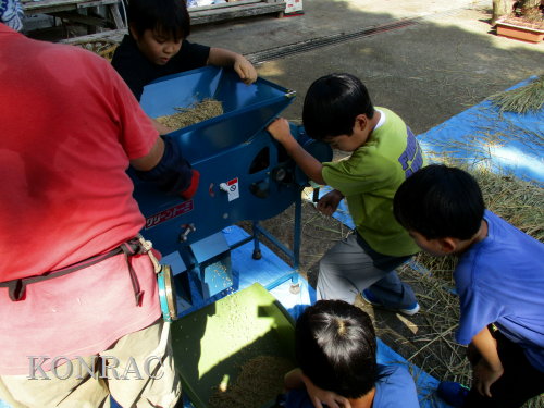 脱穀に用いた足踏み式脱穀機は、2004年にホタルの里に再生した田圃の元の地主さんからいただいたものです。 子どもたちの脱穀(イネコキ)については、初めのうちは、岩田が参加者一人一人の作業の面倒をみて行いました。