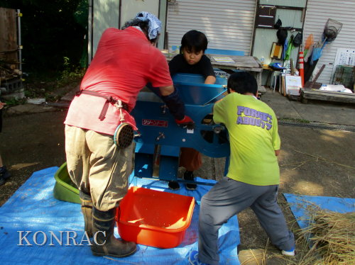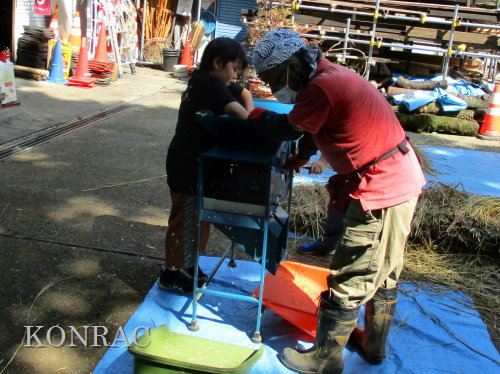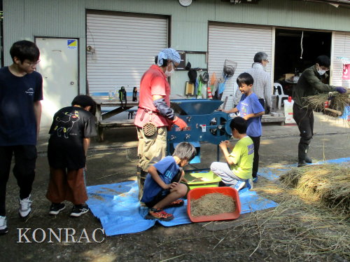 この脱穀のサポートは、数回経験してもらってから、伊澤に交代しました。 脱穀機によって脱穀されたモミなどは、北川が手箕(てみ)に集めてくれました。