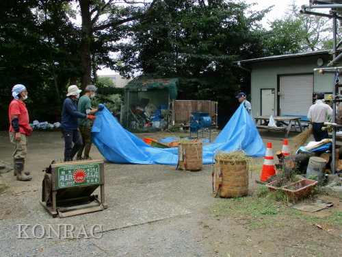 作業の終わった脱穀のためのシート、脱穀機などは片付けが進められていました。