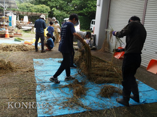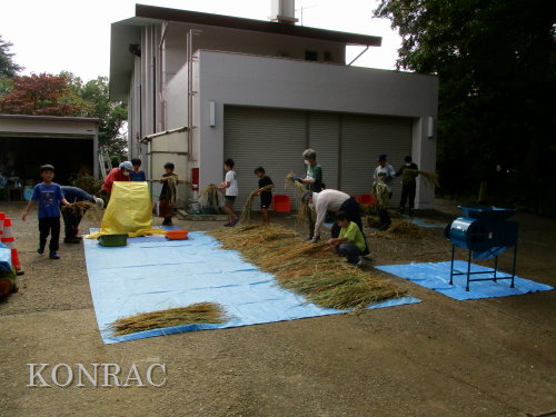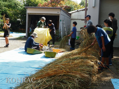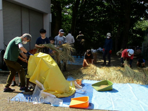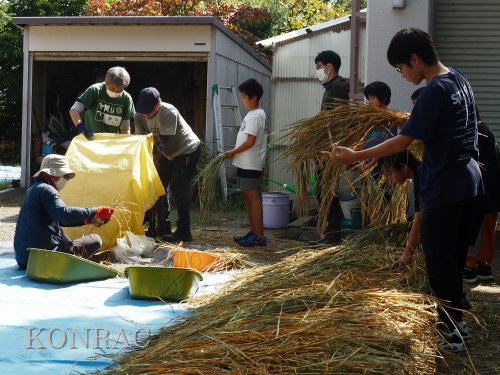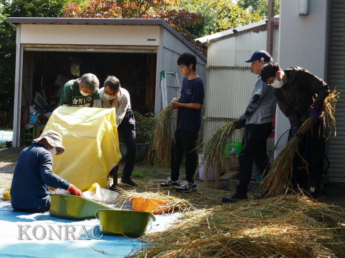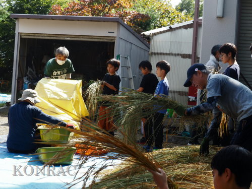 日時 2025年 10月 5日(日) 10:00〜15:00 晴後曇 場所 集合 市民活動室 活動 上の田圃、生田緑地整備事務所裏 参加(里山の自然学校 2年生)杉山智基、関山敢太、山崎晃汰 3名 (里山の自然学校 1年生)前場理宏、三重野寛、山室幹太 3名 卒業生サポーター 安達湊都 里山倶楽部応援 東陽一、北川英樹、野下智洋、吉澤正一 講師サポーター 伊澤高行、廣瀬朗子 講師・事務局 岩田臣生 合計 14 名 第8回の里山の自然学校は、脱穀です。 サポーターの皆さんは、9:00〜9:30に集まってくれて、準備を始めてくれました。 生田緑地整備事務所裏のヤードで脱穀を行います。 まず、整備事務所から竹箒を借りて、クヌギのドングリや、石ころを竹箒で掃き捨てました。