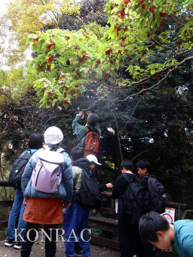 生田緑地整備事務所付近で、シロダモ、ヒイラギの観察から、活動を始めました。 シロダモは雌雄別の木で、この木は紅い実をつけて、同時に開花しているので、メスの木です。 白い花だけだったら、オスの木です。