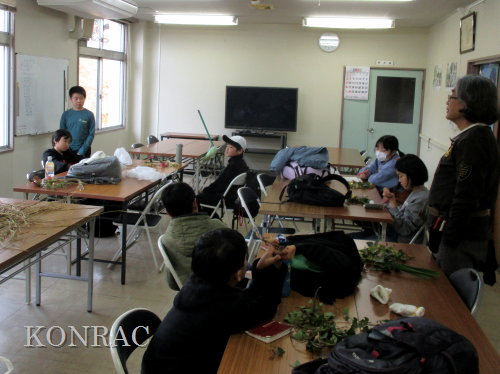 リースづくりが終わったら、希望者には、イネワラを使って、縄の綯い方の基本を教えました。