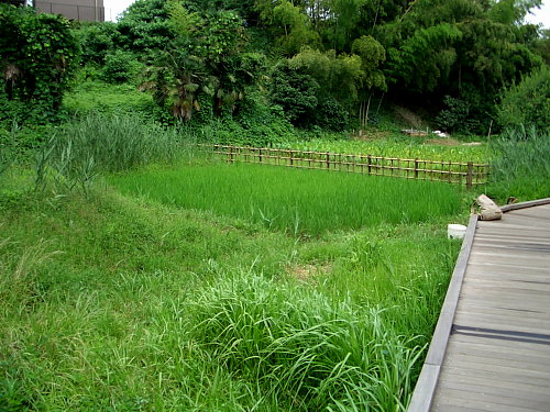 上の写真は7月6日の田圃の様子。下の写真は7月6日のホタルの里の池の木陰。ここの木道は、明るくて、平坦で、人が少ないので、平日は、ヨチヨチ歩きの子ども連れにも人気である。
