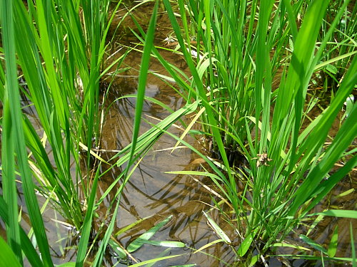 イネは60〜70cmに育っている。このイネにヤゴの脱け殻が一つついていた。また、水中を泳いでいるヤゴを1匹確認した。