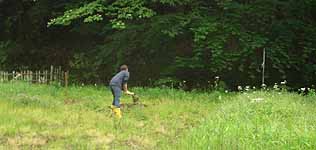 日時 2005年 5月8日(日) 10:20〜13:30 場所 生田緑地 稲目谷戸上の田圃地区 参加者 岩田臣生、岩田芳美、今井茉耶子、美馬咲子、佐藤利奈 連休が過ぎて、レンゲの花の盛期も終わったので、2枚目の田圃再生を始めました。 まずは、田圃の範囲を決め、田起しを始めました。