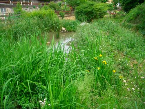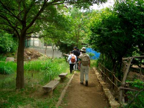 斜面下の水辺を調べていたら、中原区市民健康の森を育てる会の小須田会長に出会った。 緑政部の萩原参事と韓国 Seoul National University のYun,Su Kyeong、Jeong,Ho Seok、 Jung,Hee Jeongさんが一緒であった。市民管理による緑地の調査の様でした。