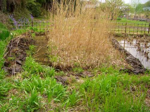 下の田圃a の保全 日時 平成16年(2006) 4月13日(木)10:30〜12:00 参加者 岩田臣生 田圃では早くもシュレーゲルアオガエルが鳴き始めました。 横山さんのクワイ畑に水を入れてあげなければならないと思いました。 下の田圃の排水口を止めて、水の流れを変え、ヨシ島の周囲の水路を復活させて、シュレーゲルアオガエルやホトケドジョウの産卵を受け入れる態勢を調えることにしました。 この水域と田圃の組み合わせが大切なのだと思っています。 久しぶりにヨシの根と格闘し、飛び散る泥を全身に浴びながらの作業をしました。2年前の田圃再生作業は、よくやったものだと自分で信じられない思いがしました。写真は下の田圃です。