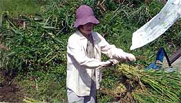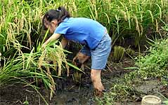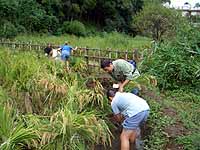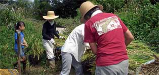 参加者 岩田臣生、岩田芳美、尾形達也、尾形優樹(小6)、景井裕美子、門脇 奨、佐藤利奈、佐山美智子、水上 健、水上涼香(小2)、美馬咲子、森 卓子 下の田圃の稲刈りとオダつくりをしました。 尾形さんと水上さんが子ども連れで参加しました。 足をエイに刺されて、歩くのも辛いという美馬さんも様子を見に来てくれました。捻挫が直りきっていない森さんも、田圃の外で参加してくれました。 アルバイトに忙しい景井さんも参加しました。 周辺にはイボクサやツリフネソウが咲き、トンボの多い日でした。アメリカザリガニを見つけると子どもたちの目が輝きました。