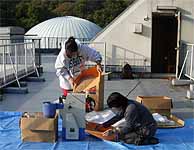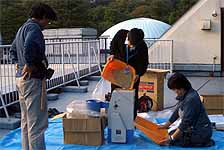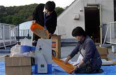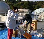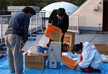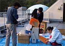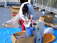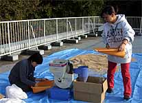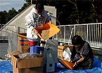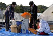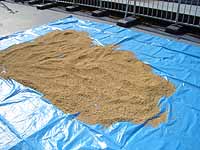 午後の打ち合わせを済ませてから、籾の干し上がり具合を見たところ籾摺りができそうな状態でしたので、 北部公園事務所から籾摺り機を借りて来て、籾摺りを行いました。籾の量が少なかったので、簡単にできると思ったのです。 青少年科学館の津田さんと野並さんが手伝ってくれました。 籾摺り後の玄米は25kg、昨年の約半分でした。