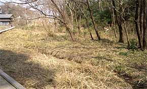 犬の糞(ふん)がある場所は5m四方ほどの場所で、そこに10個以上もありました。この場所に面した木道のわきにはノイバラの枝をヘッジにしました。