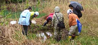 場所 生田緑地 参加者 神山歩未、小泉恵佑、佐藤利奈、雛倉正人、美馬咲子、岩田芳美・臣生 谷戸の水溜まりにどんな生き物がやってくるのか、生物調査をしていくことにしました。 この日は冷たい雨が降ったり止んだりしていましたが、その第1回目です。 谷戸の一番下に掘った池には多数のミズムシがいましたが、それ以外では、水面にヒメアメンボがいるだけでした。(水温11℃)