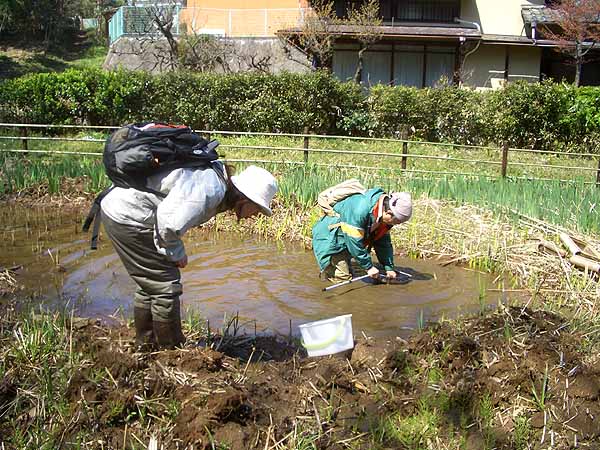 下の田圃下の隣接地、かつてクワイ畑だった場所の一部分について、前回の活動の続き、ヨシなどの根を取り除き、トロトロの田圃状態にする活動をしました。 アメリカザリガニ(6cm)1匹をつかまえました。 作業後、アナゴカゴを仕掛けましたが、トロトロの泥のため、アナゴカゴは浮き上がってしまい、トラップになりません。 活動中、ウグイスが鳴いていました。