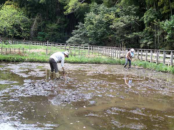 上の田圃の田起こしは3回目です。平均的に、ある程度の深さで柔らかくなってきました。 外周、畦沿いに溝を掘りました。