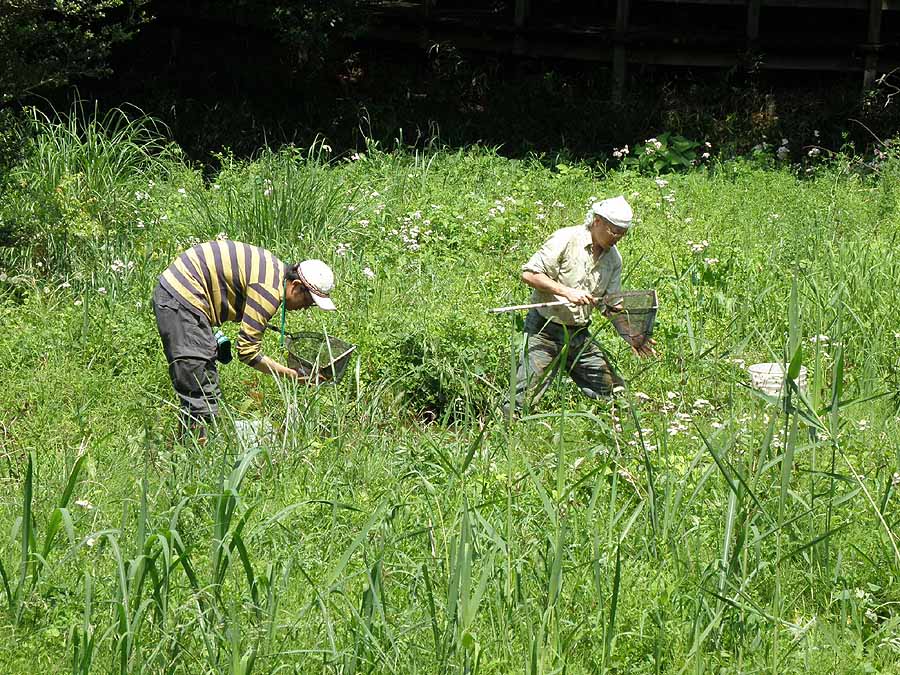 日時 2009/5/9(土) 10:00〜14:30 晴 場所 生田緑地 参加者 岩田芳美、尾形達也、神山歩未、毛部川弘行、田中 渉、雛倉正人、岩田臣生 止水域の生物調査を再開することにしました。 合わせて、なかなか実行できずにいた水環境調査を一緒に行う方法を試すことにしました。 これが上手くいくようなら毎月1回のペースで水環境調査を継続することができそうです。 そろそろ水生生物も活動を始めているだろうという期待からでしょうか、今回は7人で活動することになりました。 まず、谷戸の一番下のヨシ原まで降りて、調査をしながら上流に上がっていくことにしました。 1)ヨシ原の池 ここは昨年小さな池をつくって調査を始めたところです。昨年はアメリカザリガニによって、当初いたミズムシも、オタマジャクシも、トンボのヤゴも、 そして試験栽培のイヌタヌキモも、皆食われてしまいました。 今年は開放水面の面積を3〜4倍にしました。4月にはカルガモがやってきましたので、防鳥ネットと防鳥テープを張りました。 アメリカザリガニ・トラップも仕掛けました。 気温23.7℃、水温18℃、PH6.4(BTB)、透視度100cm (水域)アメリカザリガニ 4〜8cm 7匹、ユスリカ幼虫、ミズムシ、マメゲンゴロウ、シュレーゲルアオガエル卵塊 (周辺)メミズムシ、イネクロカメムシ、ミイデラゴミムシ、オオシモフリコメツキ、イチゴハムシ、クビキリギス、ヒメギス幼虫、ヤマサナエ、シオヤトンボ