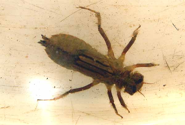 4)上の田圃下の池 ここは、昨年、上の田圃の排水を受ける池として簡単な水溜まりをつくったところです。 水漏れが甚だしく、上の田圃の水が止まると水が涸れるという状態でした。 ただ、イトトンボのヤゴ、クロセンブリの幼虫などが観察され、上の田圃から様々な生物が流されていることが分かりました。 今年は3倍程に広げました。ただ、水漏れは相変わらずです。また田圃からの土砂の流入も多いところです。 水温18.5℃、PH7.4(BTB)、7.4(PR)、透視度70cm (水中)アメリカザリガニ 2〜7cm 3、マメゲンゴロウ、ミズムシ、シュレーゲルアオガエル幼生、アズマヒキガエル幼生 (水面)ヤスマツアメンボ、ヒメアメンボ (地面)ケラ、サワガニ (空中)クロスジギンヤンマ♂、シオヤトンボ♂