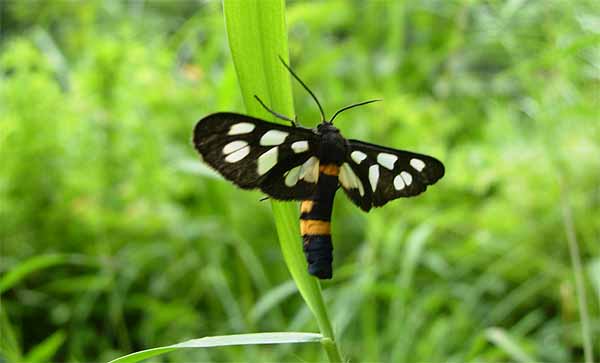 この日はホトトギスの声も聞かれましたが、ガビチョウが5〜6羽群れていました。 木道の手摺りにムツボシタマムシ(属)を見つけました。 草地にはカノコガがいました。 クリにはアオジョウカイやジョウカイボンが多数群れて、繁殖行動をしていました。