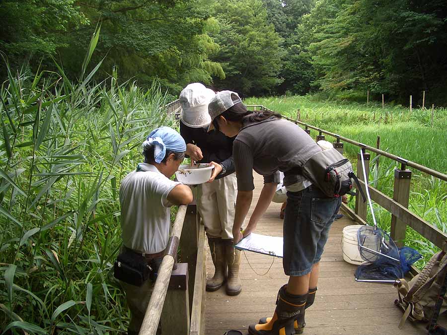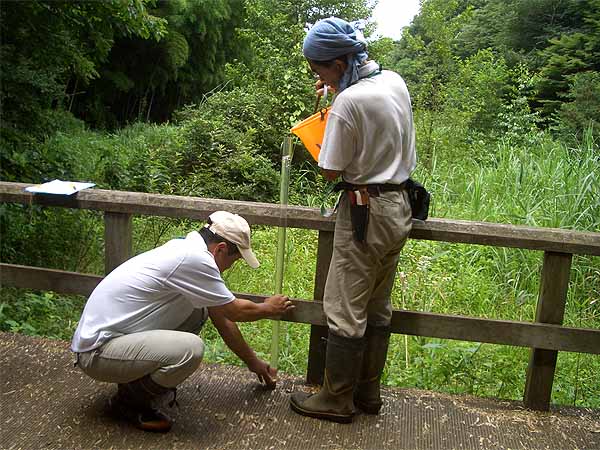 日時 2009/7/11(土) 09:00〜12:00 場所 生田緑地 参加 岩田臣生(09:00〜10:00)、岩田芳美(10:00〜12:00)、佐藤利奈 7月期のカメラを新たな場所に設置しました。 水辺調査 モニタリングサイト1000里地調査(水環境調査)と生物調査 日時 2009/7/11(土) 10:00〜14:30 場所 生田緑地 参加 岩田臣生、岩田芳美(12:00〜14:30)、神山歩未、佐藤利奈(12:00〜13:00)、下口達夫(10:00〜13:50) 7月の生田緑地の谷戸の水辺調査を行いました。 参加者が少ないので、生物調査は手網で数回掬うだけの調査としました。 K.ヨシ原の池 10:30〜 アメリカザリガニ 2cm×35、6〜8cm×8、コミズムシ 1、シュレーゲルアオガエル幼生 多数、クロスジギンヤンマ幼虫 5 オオシオカラトンボ♂ 1 B.中央水路末端部 11:05〜 水温20℃、透視度37cm、PH 7.2、流量計測不能 A.下の田圃 11:20〜 水温19℃、透視度28cm、PH 6.5、流量 14.3?/min ホトケドジョウ 1〜3cm×19、マメゲンゴロウ 1、カワニナ 1、クロセンブリ幼虫 1、アメリカザリガニ 5cm×1 ショウジョウトンボ 2、オオシオカラトンボ♂ 1、シオカラトンボ♂ 2 ヒメギス 多数、ニイニイゼミ 木道わきのミゾソバの葉にカメムシ類の幼虫が集まっていました。 9日後の20日にも、この何分の1かが、この辺に集まっていて、成虫からヒメジュウジナガカメムシだろうと分かりました。