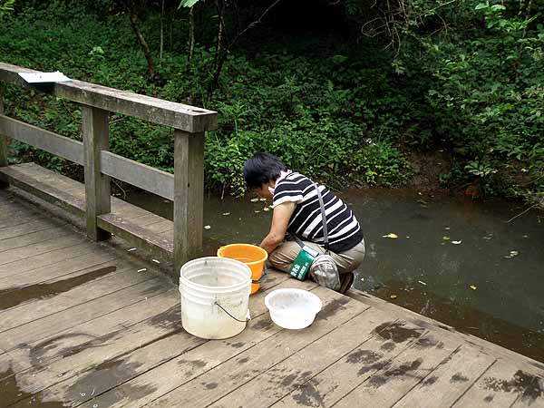 G.湿地 13:05〜13:50 気温23.5℃、水温20℃、透視度65cm ミズムシ 3、ホトケドジョウ 38、シュレーゲルアオガエル 2、同幼生 17、カワニナ 9、アメンボ類 数匹、サワガニ、クロセンブリ幼虫 2 アメリカザリガニ 1〜2cm×45、3〜4cm×6、5〜7cm×3 シオカラトンボ、オオシオカラトンボ、クロコノマチョウ、カマキリ 3 アメンボ類 数匹、サワガニ、クロセンブリ幼虫 2