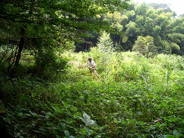 日時 2009/8/22(土) 10:30〜13:00 晴 場所 生田緑地の谷戸 参加 岩田臣生、岩田芳美、尾形達也、毛部川弘行、徳江義宏 はじめに、ヨシ原までゆっくり観察しながら歩き、状況を把握してもらいました。 夏の湿地の植物の成長は著しく、水面が悉く覆われてしまっていました。 しかも、湧水の流量は半減し、殆どの止水域が涸れてしまいました。 そこで、僅かになった湧水をできるだけ活かすための手入れをすることにしました。 この日は湿地再生地の水域を覆っていたヨシやミゾソバなどを刈り、水面を開放しました。 既に、一番上の段につくった水域は水が涸れていましたので、澪筋をつけ、水が流れ込むように積もった土砂を移動しました。 水が少しずつ入り始めましたが、溜まるまでには時間がかかりそうです。