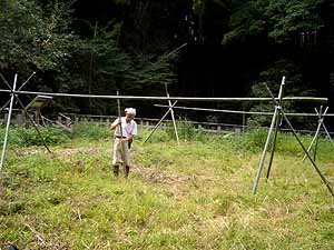 運んだ竹を組み立てて、オダを2本つくりました。