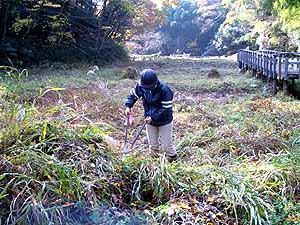 この日の草刈りは、上の田圃下から谷戸の合流部にかけての草地(湿地)のオギやジュズダマ、ヤマグワなどを刈り取り、