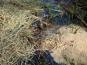 谷戸の水辺の裾刈り 日時 2009/12/17(木) 11:00〜13:00 晴 場所 生田緑地 参加 岩田芳美、岩田臣生 野鳥の森の現地協議を終えてから、倉庫のイネワラを一抱え谷戸の田圃に運んでおいて、水流沿いの斜面の裾刈りの続きを行いました。 田圃には薄氷が張ったようで、解け残った氷があちこちに少しずつ見られました。 斜面には落葉が厚く積もっていて、その下にコナラのドングリが発根していました。 この日は小学生がグループでフィールド活動をしていたようで、元気な声が谷戸に響いていました。